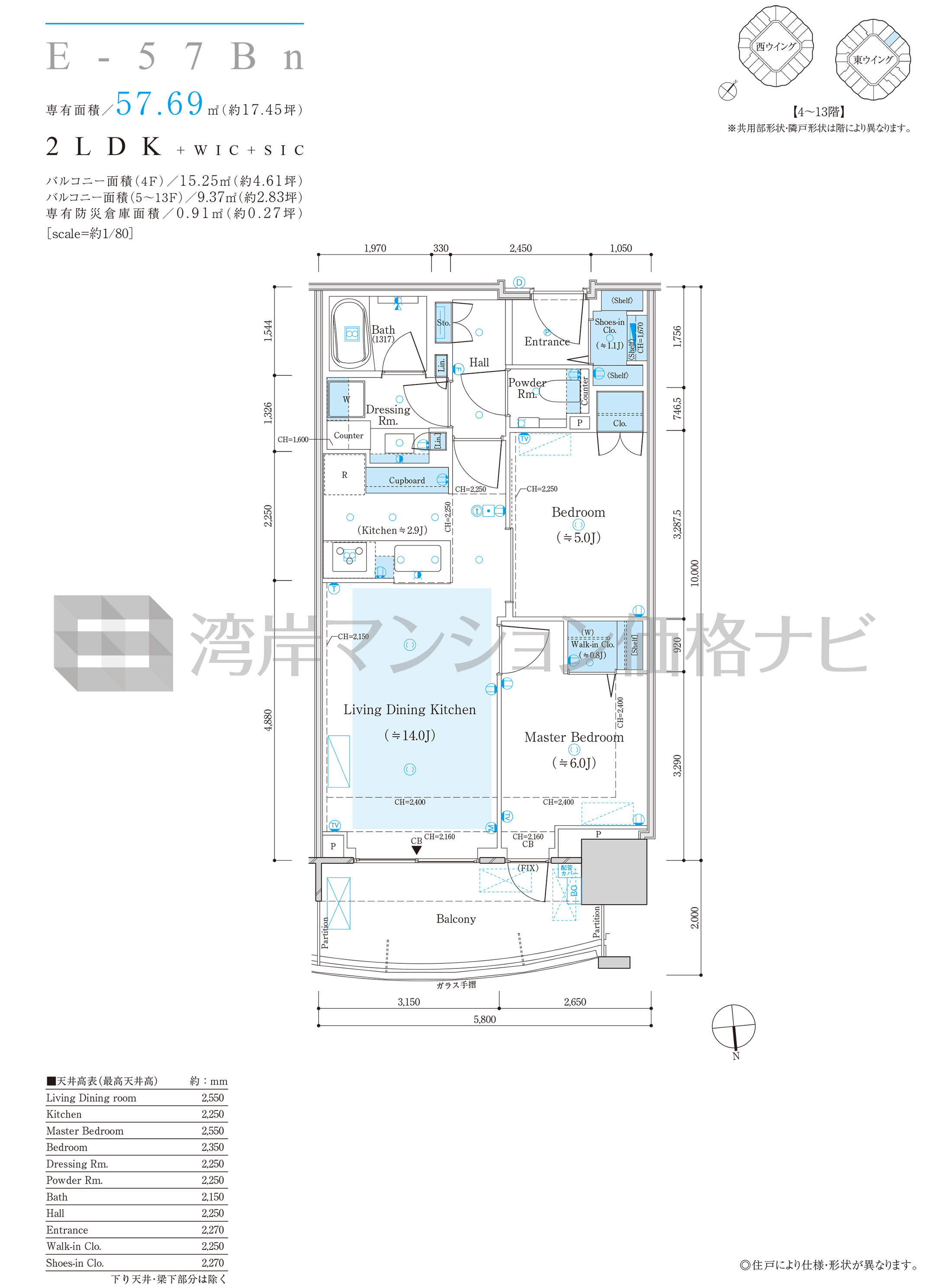 E-57Bn タイプ 間取り2LDK専有面積57.69m²