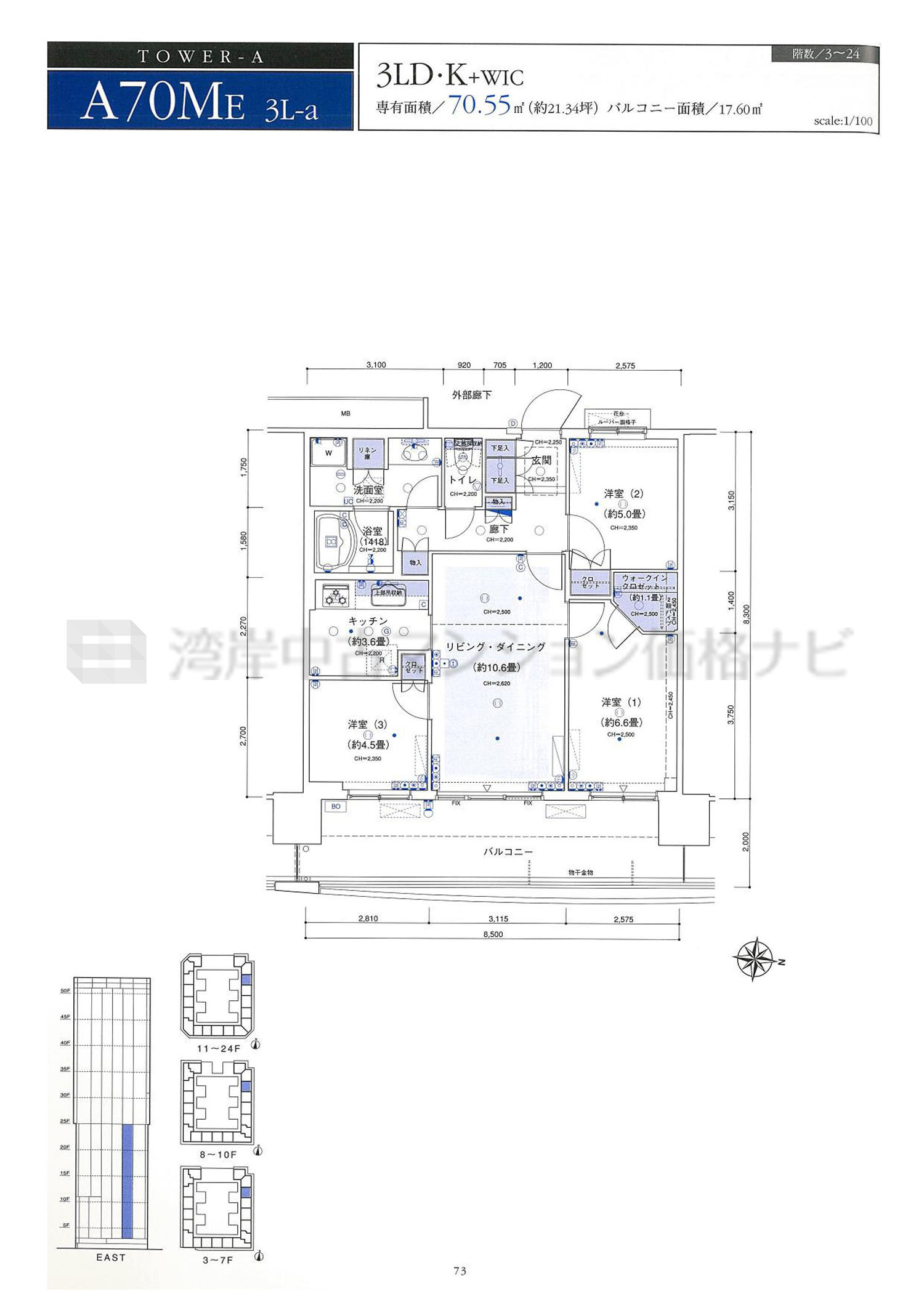 売出中住戸あり A70ME タイプ 間取り3LDK専有面積70.55m²